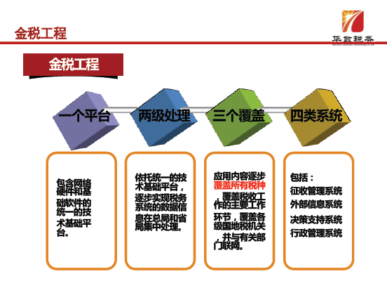 金稅工程是1994年1月我國推行新稅制,核心内容是建立以增值稅為主體稅種的稅制體系,并實施以專用發票為主扣稅憑證的增值稅征管制度。金稅工程是一個不斷優化的系統,旨在最終實現一個平台,兩級處理,三個覆蓋,四類系統。
